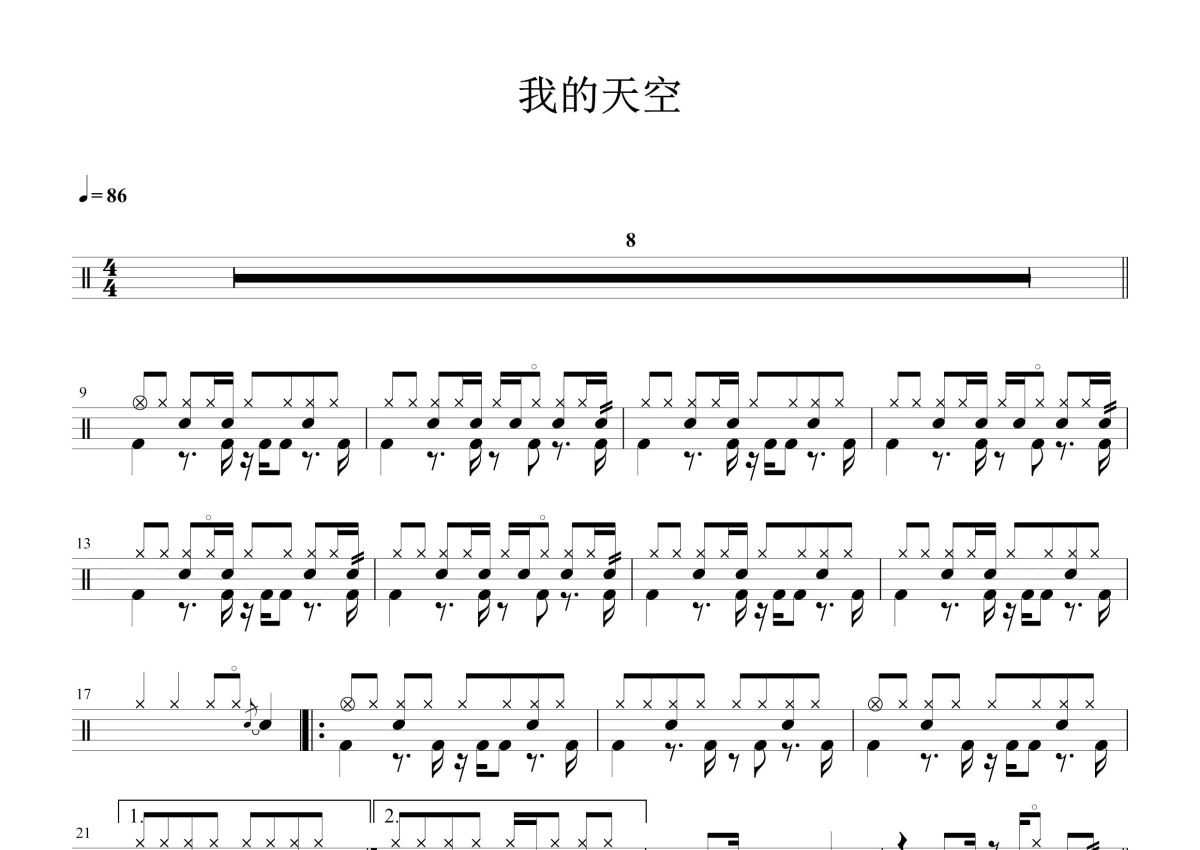《我的天空》是南征北战演唱的一首歌曲,这份鼓谱共有两张高清图谱,图谱由 @打鼓谱 编配上传,图谱使用五线谱编配,使用这份我的天空架子鼓谱,你将能够轻松地敲打出这首南征北战的我的天空,快来尝试吧。《我的天空》是南征北战NZBZ为电影《青春派, 创作的主题曲和片尾曲,由南征北战NZBZ作词、作曲并演唱,后收录于南征北战NZBZ2016年5月25日发行的专辑《6415》中,该歌曲蝉联QQ音乐、酷狗音乐、酷我音乐、网易云音乐等各大音乐平台热歌榜近24个月,获一致好评。
