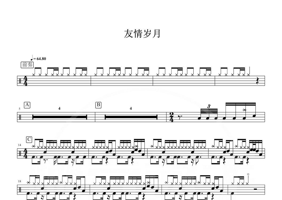 《友情岁月》是郑伊健演唱的一首歌曲,这份鼓谱共有两张高清图谱,图谱由 @打鼓谱 编配上传,图谱使用五线谱编配,使用这份友情岁月架子鼓谱,你将能够轻松地敲打出这首郑伊健的友情岁月,快来尝试吧。《友情岁月》是1996年上映的电影《古惑仔之人在江湖》和《古惑仔2之猛龙过江》的主题曲,由刘卓辉作词,陈光荣作曲并编曲,郑伊健演唱,最早收录在1996年4月索尼音乐发行的原声带专辑《古惑仔Ⅱ之猛龙过江 电影原声音乐》中,后收录在郑伊健1997年5月9日由索尼音乐发行的专辑《伊健·十三》中。