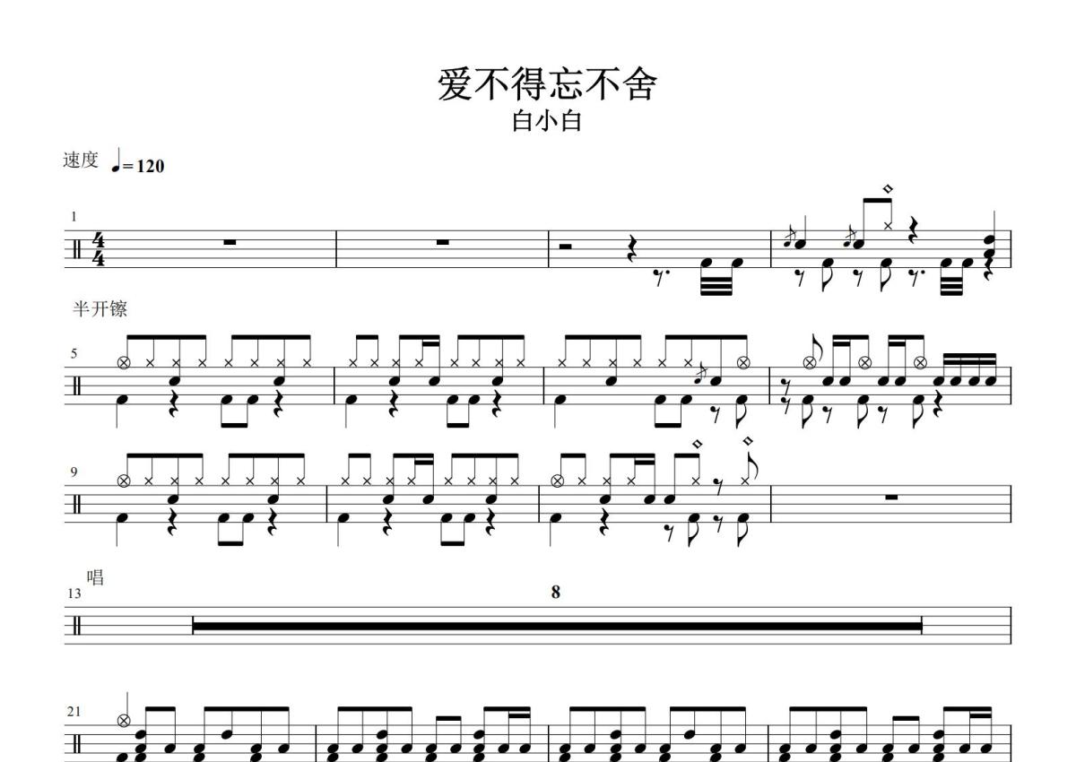 《爱不得忘不舍》是白小白演唱的一首歌曲,这份鼓谱共有三张高清图谱,图谱由 @打鼓谱 编配上传,图谱使用五线谱编配,使用这份爱不得忘不舍架子鼓谱,你将能够轻松地敲打出这首白小白的爱不得忘不舍,快来尝试吧。《爱不得忘不舍》是由林华勇作词、作曲,白小白演唱的歌曲,发行于2020年1月9日。 [1] 收录于同名专辑《爱不得忘不舍》中。