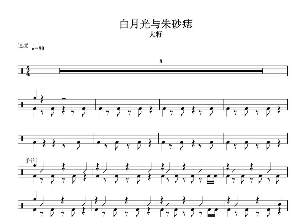 《白月光与朱砂痣》是大籽演唱的一首歌曲,这份鼓谱共有两张高清图谱,图谱由 @打鼓谱 编配上传,图谱使用五线谱编配,使用这份白月光与朱砂痣架子鼓谱,你将能够轻松地敲打出这首大籽的白月光与朱砂痣,快来尝试吧。《白月光与朱砂痣》是由黄千芊和王佳滢作词,黄千芊和田桂宇作曲,大籽演唱的歌曲,发行于2021年1月1日。 [1] 收录于同名专辑《白月光与朱砂痣》中。