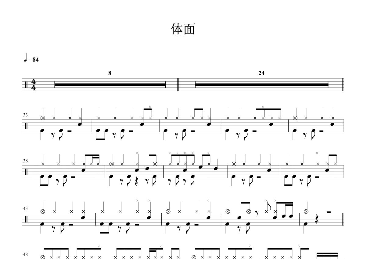 《体面》是于文文演唱的一首歌曲,这份鼓谱共有两张高清图谱,图谱由 @打鼓谱 编配上传,图谱使用五线谱编配,使用这份体面架子鼓谱,你将能够轻松地敲打出这首于文文的体面,快来尝试吧。《体面》是电影《前任3:再见前任》的插曲,由唐恬作词,郑楠编曲,于文文作曲并演唱,单曲于2017年12月25日发行。后收录在于文文于2018年11月7日发行的专辑《尚未界定Undefined》中。