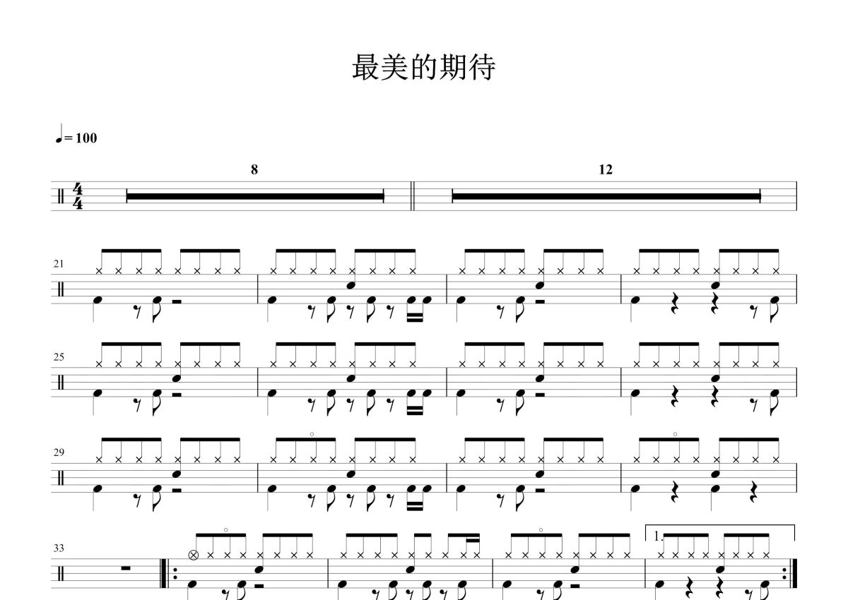 《最美的期待》是周笔畅演唱的一首歌曲,这份鼓谱共有一张高清图谱,图谱由 @打鼓谱 编配上传,图谱使用五线谱编配,使用这份最美的期待架子鼓谱,你将能够轻松地敲打出这首周笔畅的最美的期待,快来尝试吧。《最美的期待》是周笔畅演唱的歌曲,亦是电视剧《茧镇奇缘》片头曲,由南征北战NZBZ创作词曲,于2018年1月18日单曲发行。2018年,该曲获得流行音乐全金榜2018上半年20大金曲奖 。