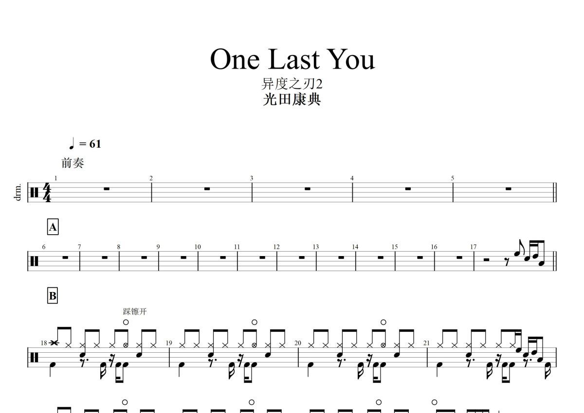 《One Last You》是光田康典演唱的一首歌曲,这份鼓谱共有三张高清图谱,图谱由 @打鼓谱 编配上传,图谱使用五线谱编配,使用这份One Last You架子鼓谱,你将能够轻松地敲打出这首光田康典的One Last You,快来尝试吧。One Last You 专辑:Xenoblade 2 Original Soundtrack 歌手:光田康典 Various Artists - One Last You The very end of eternity The final day has come to an end It's gone for good ...。