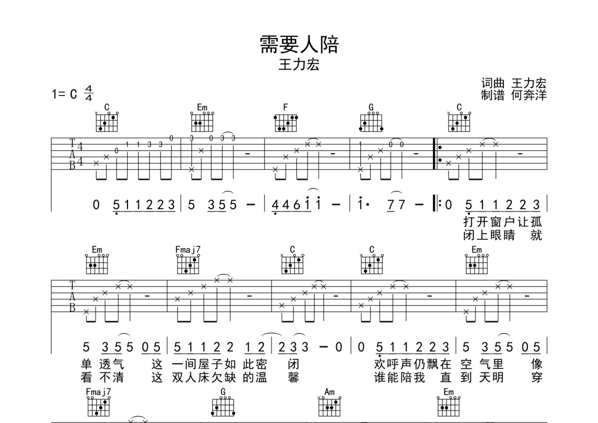 王力宏《需要人陪》吉他谱 - C调弹唱六线谱