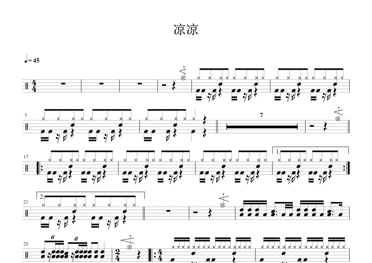 《凉凉》是杨宗纬演唱的一首歌曲,这份鼓谱共有一张高清图谱,图谱由 @打鼓谱 编配上传,图谱使用五线谱编配,使用这份凉凉架子鼓谱,你将能够轻松地敲打出这首杨宗纬的凉凉,快来尝试吧。《凉凉》是电视剧《三生三世十里桃花》的片尾曲,由刘畅作词,谭旋作曲,张碧晨、杨宗纬演唱,收录在2017年2月18日发行的专辑《三生三世十里桃花 电视剧原声带》中,