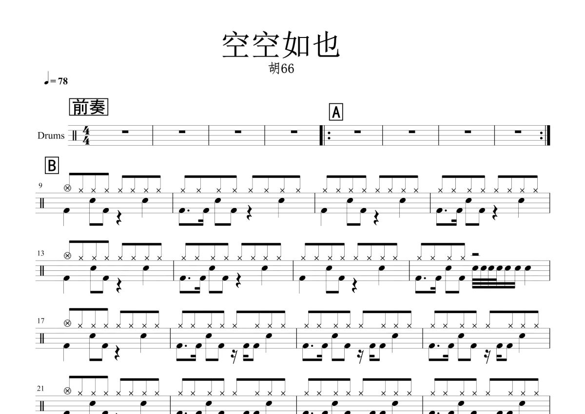 胡66《空空如也》鼓谱 - 架子鼓谱
