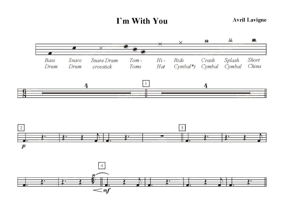 《I'm With You》是Avril Lavigne演唱的一首歌曲,这份鼓谱共有两张高清图谱,图谱由 @打鼓谱 编配上传,图谱使用五线谱编配,使用这份I'm With You架子鼓谱,你将能够轻松地敲打出这首Avril Lavigne的I'm With You,快来尝试吧。《I'm with You》是加拿大唱作女歌手艾薇儿·拉维尼演唱的一首抒情歌曲,歌词、音谱均由艾薇儿·拉维尼、劳伦·克里斯蒂、斯科特·斯波克、格雷厄姆·爱德华兹编写 [1] 。该歌曲收录在艾薇儿·拉维尼于2002年6月4日发行的的首张录音室专辑《Let Go》,作为专辑中的第三波单曲 [2] ,于2002年11月19日通过Arista Records发布。