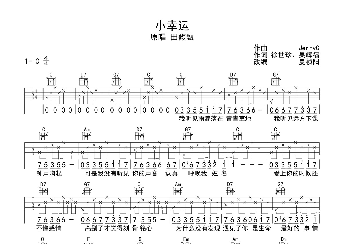 《小幸运》是田馥甄演唱的一首歌曲,本吉他谱采用的是C调指法编配,这份吉他谱共有两张高清图谱,图谱由 @梦马音乐官方 编配上传,图谱使用六线谱编配,包含吉他和弦指法、简谱以及歌词部分,使用这份小幸运吉他谱,可以让你更加方便地掌握这首歌曲的弹唱技巧,快来尝试吧。