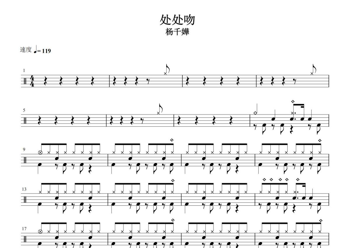 《处处吻》是杨千嬅演唱的一首歌曲,这份鼓谱共有三张高清图谱,图谱由 @打鼓谱 编配上传,图谱使用五线谱编配,使用这份处处吻架子鼓谱,你将能够轻松地敲打出这首杨千嬅的处处吻,快来尝试吧。粤语歌曲《处处吻》,由杨千嬅演唱,由林夕作词,雷颂德作曲、编曲 [1-2] ,收录于环球唱片(Universal Music)旗下的百代唱片(EMI)公司2004年6月25日发行的专辑《电光幻影》中 [3] 。同时还收录于环球唱片(Universal Music)旗下的新艺宝唱片(Cinepoly Record.Co.Ltd)公司2007年2月1日发行的专辑《Simply Me》中 [4-5] 。