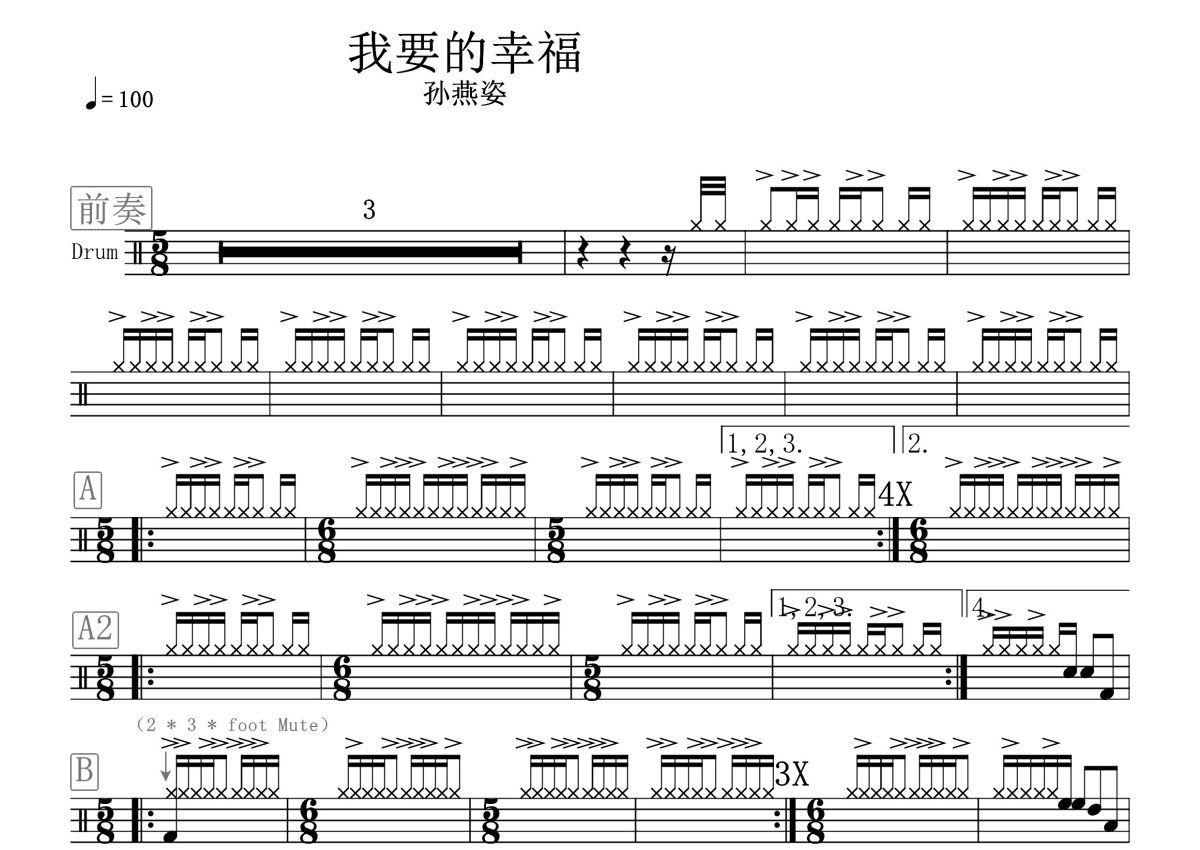 《我要的幸福》是孙燕姿演唱的一首歌曲,这份鼓谱共有三张高清图谱,图谱由 @打鼓谱 编配上传,图谱使用五线谱编配,使用这份我要的幸福架子鼓谱,你将能够轻松地敲打出这首孙燕姿的我要的幸福,快来尝试吧。《我要的幸福》是孙燕姿演唱的歌曲,由严云农作词,李伟菘作曲,收录于2000年发行的同名专辑《我要的幸福》。2001年,该曲获得台湾金曲奖最佳编曲奖、新加坡金曲奖十大金曲奖。 。