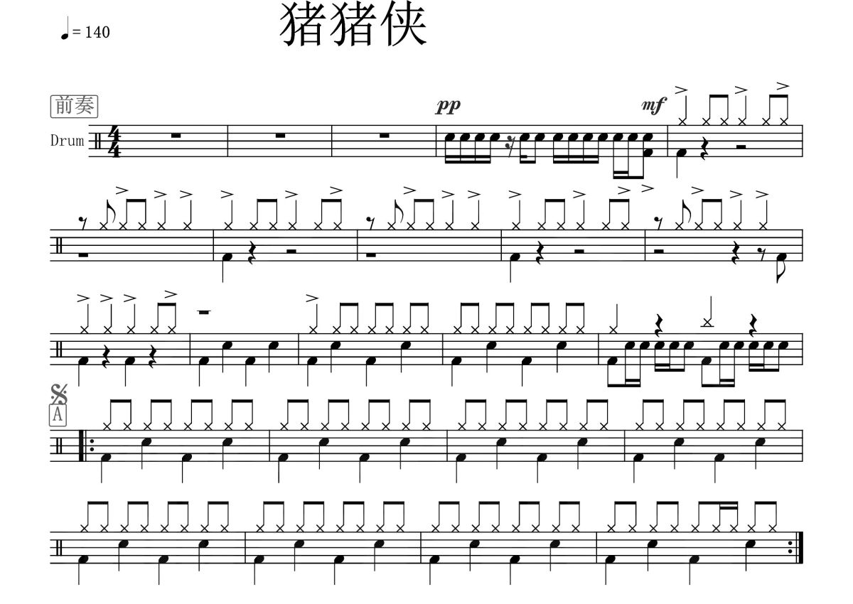 《猪猪侠》是陈洁丽演唱的一首歌曲,这份鼓谱共有两张高清图谱,图谱由 @打鼓谱 编配上传,图谱使用五线谱编配,使用这份猪猪侠架子鼓谱,你将能够轻松地敲打出这首陈洁丽的猪猪侠,快来尝试吧。《猪猪侠》是王巍作词、作曲,陈洁丽演唱的一首歌,是系列动画《猪猪侠》1-4部的主题曲,6-7部的片尾曲。