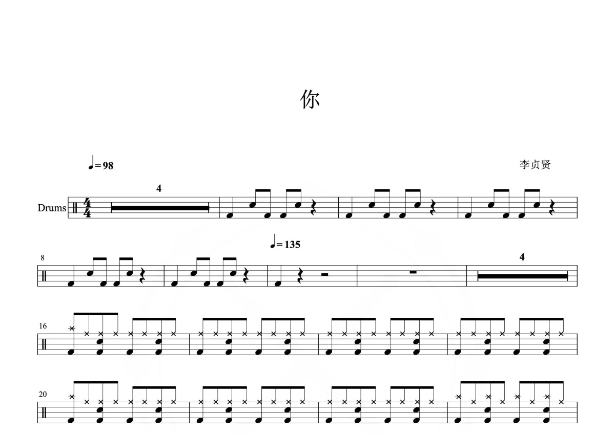 《你》是李贞贤演唱的一首歌曲,这份鼓谱共有三张高清图谱,图谱由 @打鼓谱 编配上传,图谱使用五线谱编配,使用这份你架子鼓谱,你将能够轻松地敲打出这首李贞贤的你,快来尝试吧。《你》(너)是韩国歌手李贞贤的歌,来自2000年6月10日发表的第二张专辑《Lee Jung Hyun Ⅱ》。 。