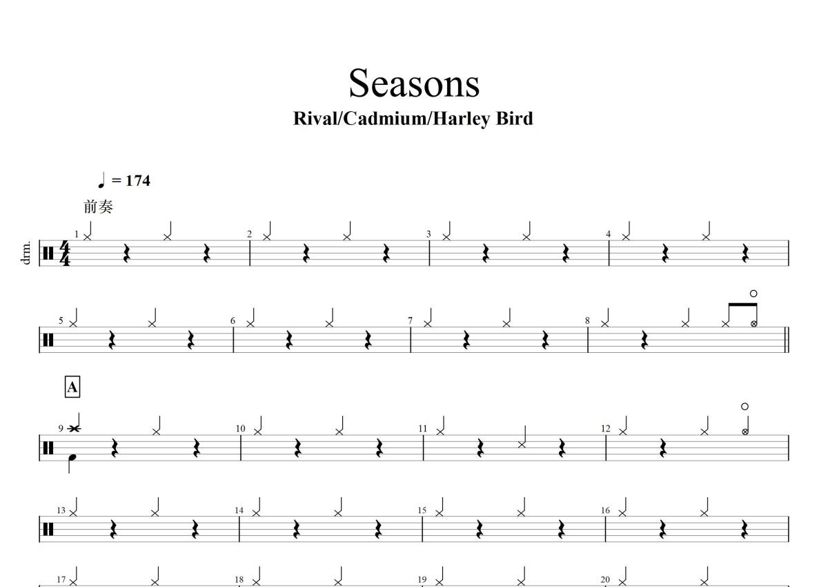 《Seasons》是Rival.Cadmium.Harley Bird演唱的一首歌曲,这份鼓谱共有三张高清图谱,图谱由 @打鼓谱 编配上传,图谱使用五线谱编配,使用这份Seasons架子鼓谱,你将能够轻松地敲打出这首Rival.Cadmium.Harley Bird的Seasons,快来尝试吧。 专辑:Seasons发行时间:2018-04-04 Seasons - Rival/Cadmium/Harley Bird Composed by:Alex Clark/Harley Bird/Valentin Rieff The seasons come and go like tho...。