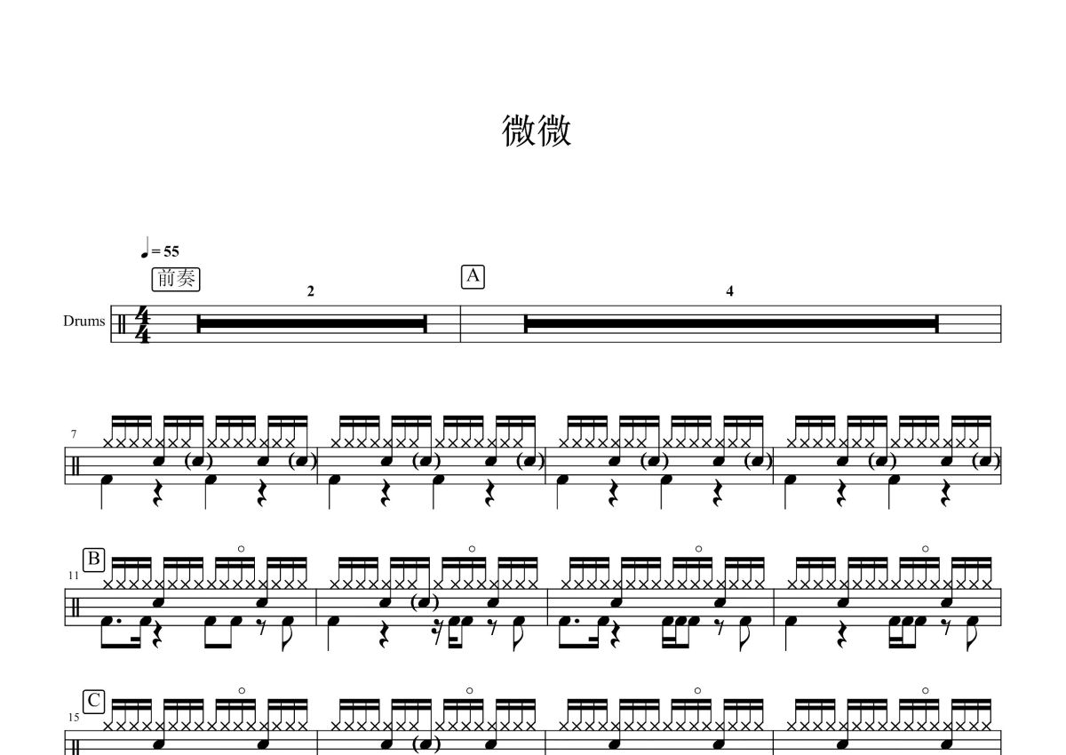 《薇薇》是傅如乔演唱的一首歌曲,这份鼓谱共有两张高清图谱,图谱由 @打鼓谱 编配上传,图谱使用五线谱编配,使用这份薇薇架子鼓谱,你将能够轻松地敲打出这首傅如乔的薇薇,快来尝试吧。《微微》是由潘凯和周禹成作词,周禹成作曲,周禹成编曲,傅如乔演唱的歌曲,收录于同名专辑《微微》,发行于2020年3月20日。