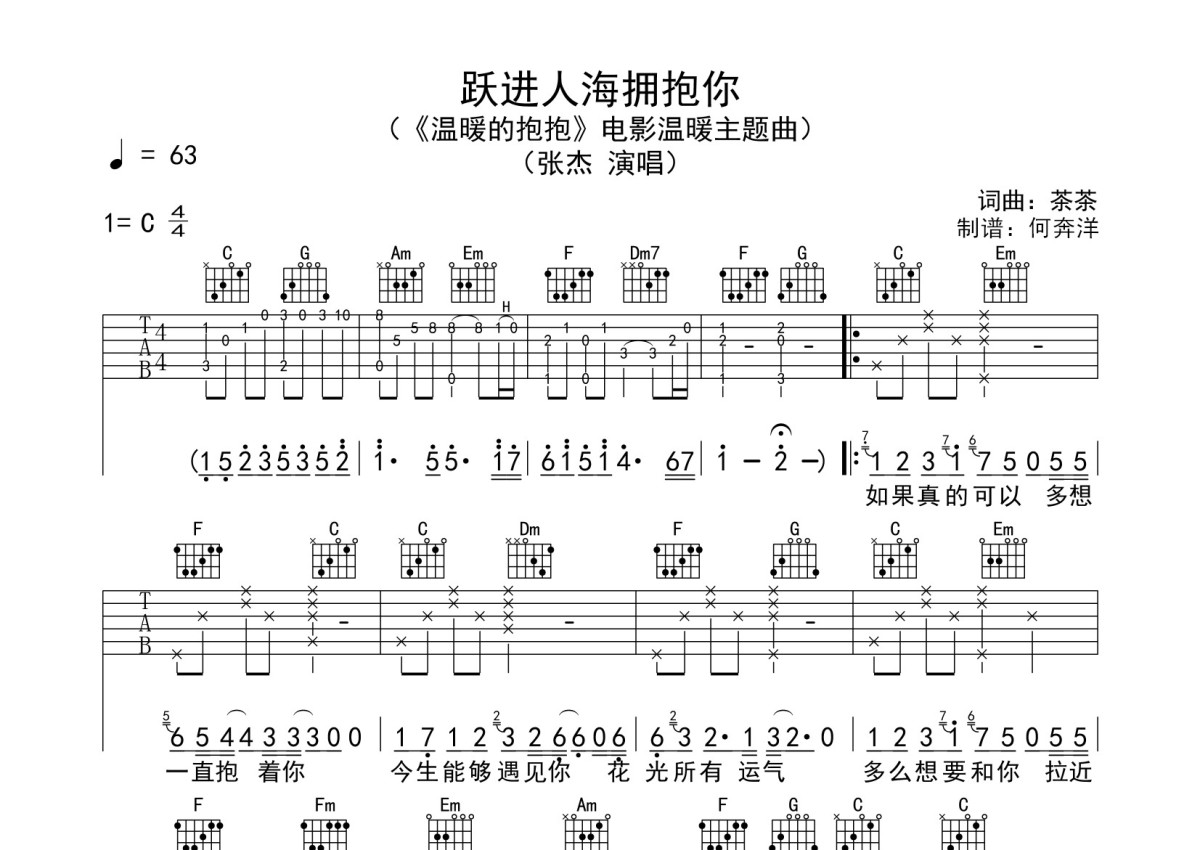 张杰《跃进人还拥抱你》吉他谱 - C调弹唱六线谱