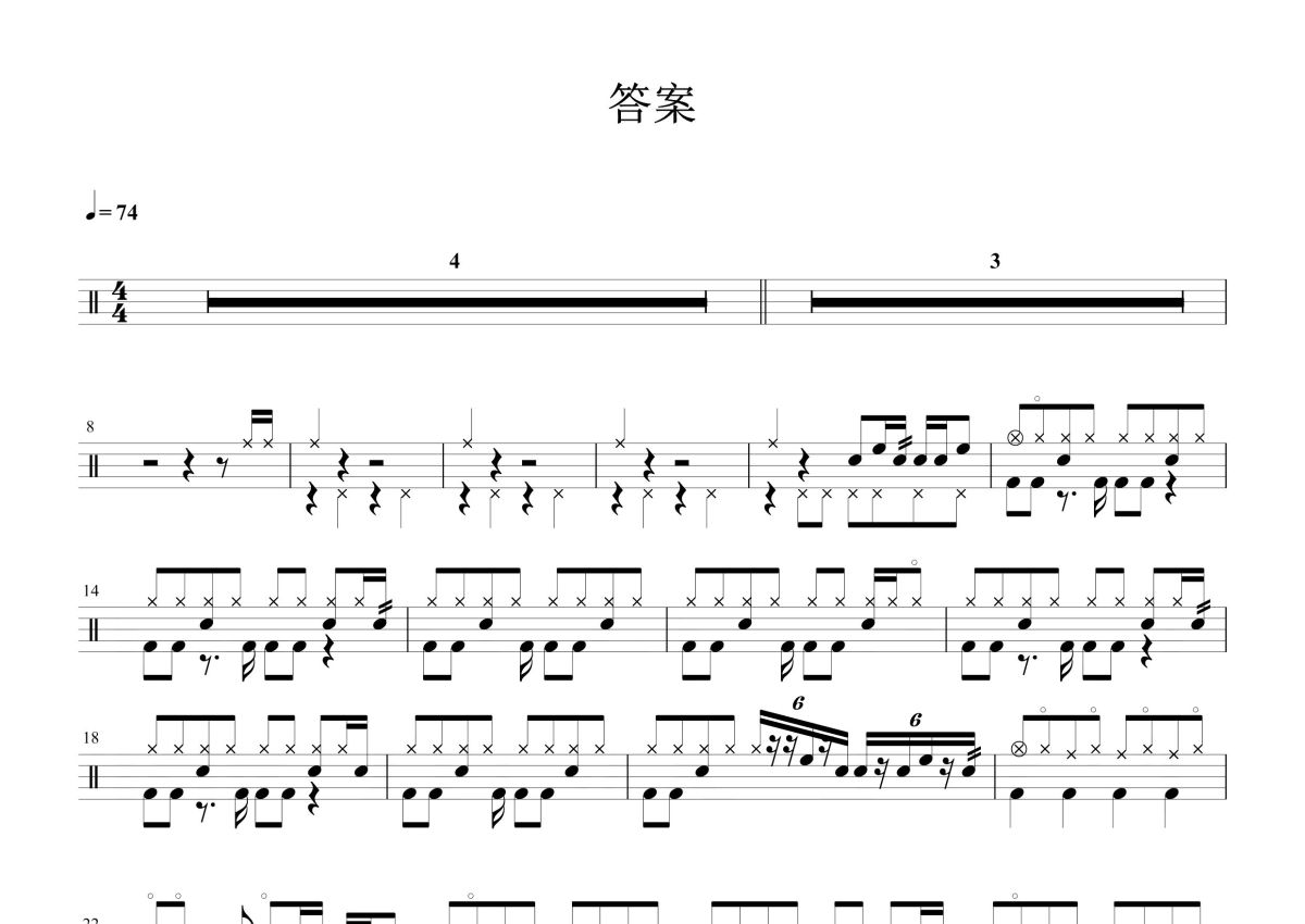 《答案》是杨坤演唱的一首歌曲,这份鼓谱共有两张高清图谱,图谱由 @打鼓谱 编配上传,图谱使用五线谱编配,使用这份答案架子鼓谱,你将能够轻松地敲打出这首杨坤的答案,快来尝试吧。《答案》是由梁芒填词,杨坤作曲并和郭采洁合唱的一首歌曲,收录于杨坤2014年9月2日发行的专辑《今夜二十岁》中。 2015年3月30日,该曲获得东方风云榜最佳对唱奖。
