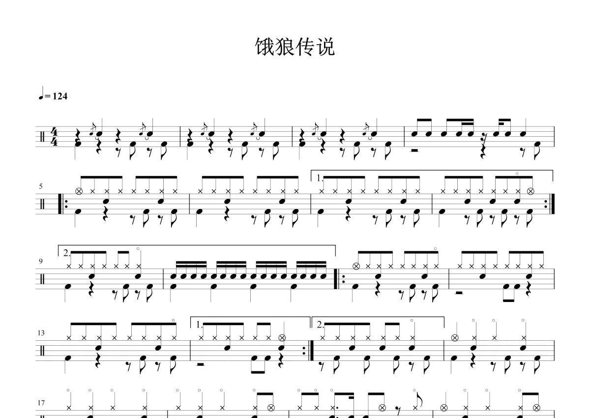 《饿狼传说》是张学友演唱的一首歌曲,这份鼓谱共有三张高清图谱,图谱由 @打鼓谱 编配上传,图谱使用五线谱编配,使用这份饿狼传说架子鼓谱,你将能够轻松地敲打出这首张学友的饿狼传说,快来尝试吧。《饿狼传说》是香港歌手张学友于1994年5月20日发行的第十四张粤语专辑,该专辑共收录了10首歌曲。专辑中的歌曲演唱者主要为张学友。 1994年,专辑中的《饿狼传说》获得第17届十大中文金曲。