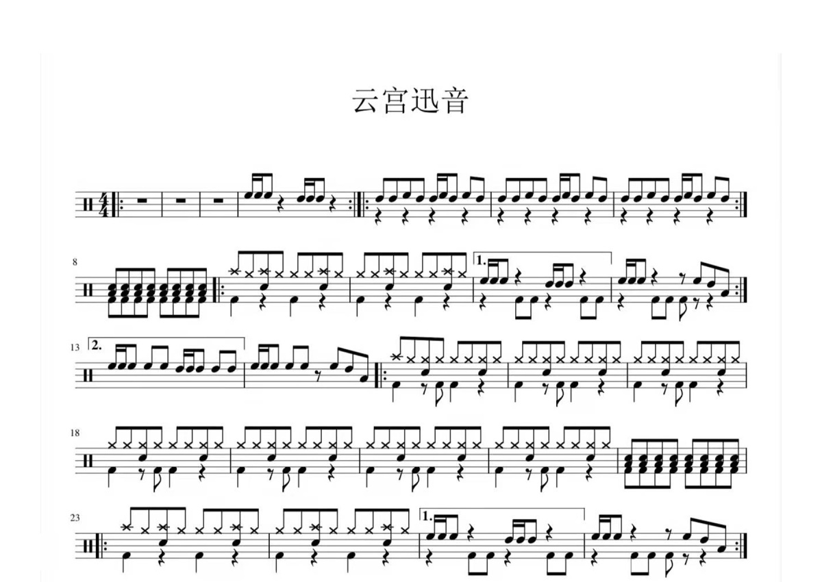 《云宫迅音》是西游记演唱的一首歌曲,这份鼓谱共有两张高清图谱,图谱由 @打鼓谱 编配上传,图谱使用五线谱编配,使用这份云宫迅音架子鼓谱,你将能够轻松地敲打出这首西游记的云宫迅音,快来尝试吧。《云宫迅音》,原名《西游记序曲》。