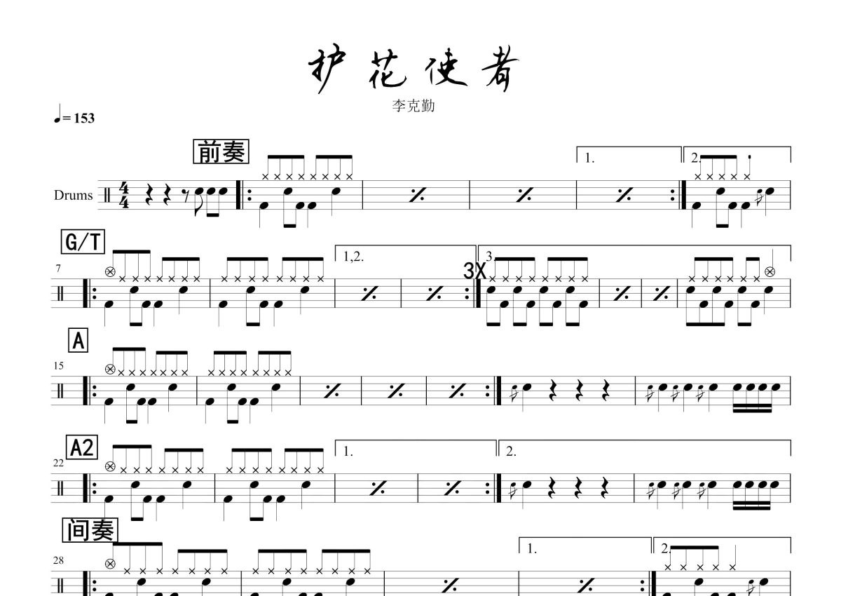 李克勤《护花使者》鼓谱 - 架子鼓谱