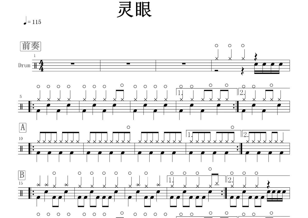 《灵眼》是九宝乐队演唱的一首歌曲,这份鼓谱共有两张高清图谱,图谱由 @打鼓谱 编配上传,图谱使用五线谱编配,使用这份灵眼架子鼓谱,你将能够轻松地敲打出这首九宝乐队的灵眼,快来尝试吧。歌名:灵眼 作曲 : 阿斯汗 作词 : 阿斯汗 编曲:九宝乐队 歌手:九宝乐队 所属专辑:灵眼。