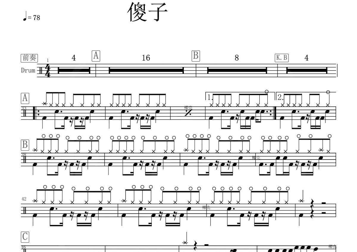 《傻子》是林宥嘉演唱的一首歌曲,这份鼓谱共有一张高清图谱,图谱由 @打鼓谱 编配上传,图谱使用五线谱编配,使用这份傻子架子鼓谱,你将能够轻松地敲打出这首林宥嘉的傻子,快来尝试吧。《傻子》是一首普通话流行歌曲,由郑楠、张鹏鹏填词,张楠谱曲,林宥嘉演唱。收录在林宥嘉的个人专辑《大小说家》中。 这首歌作为上映电影《LOVE》的主题曲,于2012年1月16日全球首播。