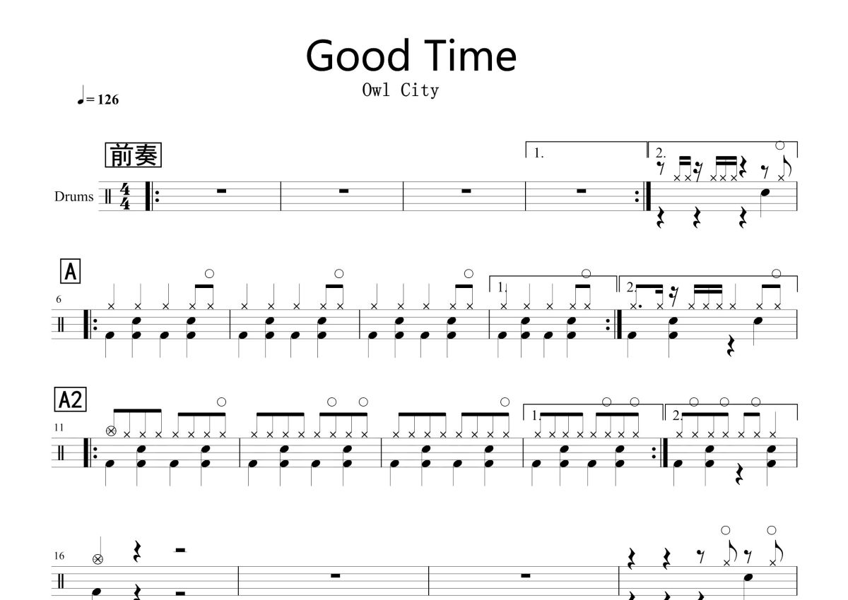 《Good Time》是Owl City演唱的一首歌曲,这份鼓谱共有两张高清图谱,图谱由 @打鼓谱 编配上传,图谱使用五线谱编配,使用这份Good Time架子鼓谱,你将能够轻松地敲打出这首Owl City的Good Time,快来尝试吧。Owl City联手Carly Rae Jepsen新单《Good Time》在2012年6月21日发布在《The Midsummer Station》专辑里。