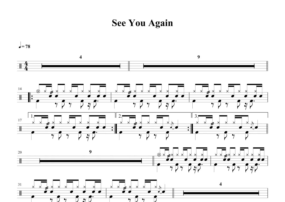 《See You Again》是Wiz Khalifa&Charlie Puth演唱的一首歌曲,这份鼓谱共有一张高清图谱,图谱由 @打鼓谱 编配上传,图谱使用五线谱编配,使用这份See You Again架子鼓谱,你将能够轻松地敲打出这首Wiz Khalifa&Charlie Puth的See You Again,快来尝试吧。《See You Again》是由美国说唱歌手维兹·卡利法与歌手查理·普斯合作演唱的一首歌曲,歌词、曲谱由DJ Frank E、查理·普斯、维兹·卡利法和安德鲁·希达尔等人共同创作完成。《See You Again》作为该电影的片尾曲和主题曲于2015年3月17日发行,被收录在电影《速度与激情7》原声专辑和查理·普斯2016年1月29日发行的录音室专辑《Nine Track Mind》中 。