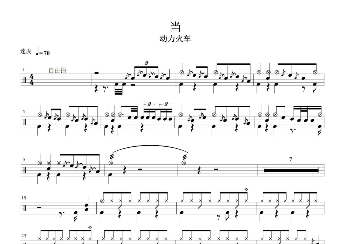 《当》是动力火车演唱的一首歌曲,这份鼓谱共有两张高清图谱,图谱由 @打鼓谱 编配上传,图谱使用五线谱编配,使用这份当架子鼓谱,你将能够轻松地敲打出这首动力火车的当,快来尝试吧。《当》是中国台湾演唱组合动力火车演唱的一首歌曲,也是1998年电视剧《还珠格格》第一部的片头曲和《新还珠格格》的插曲之一 [1] ,歌曲由琼瑶作词,庄立帆、郭文琮作曲,屠颖编曲 [2-3] ,最早收录在1998年9月16日上华唱片发行的原声带专辑《还珠格格・苍天有泪 琼瑶大卖连续剧全纪录》中 [4] ,后收录于动力火车2004年4月发行的精选加翻唱专辑《就是红光辉全记录》中 [2-3] 。