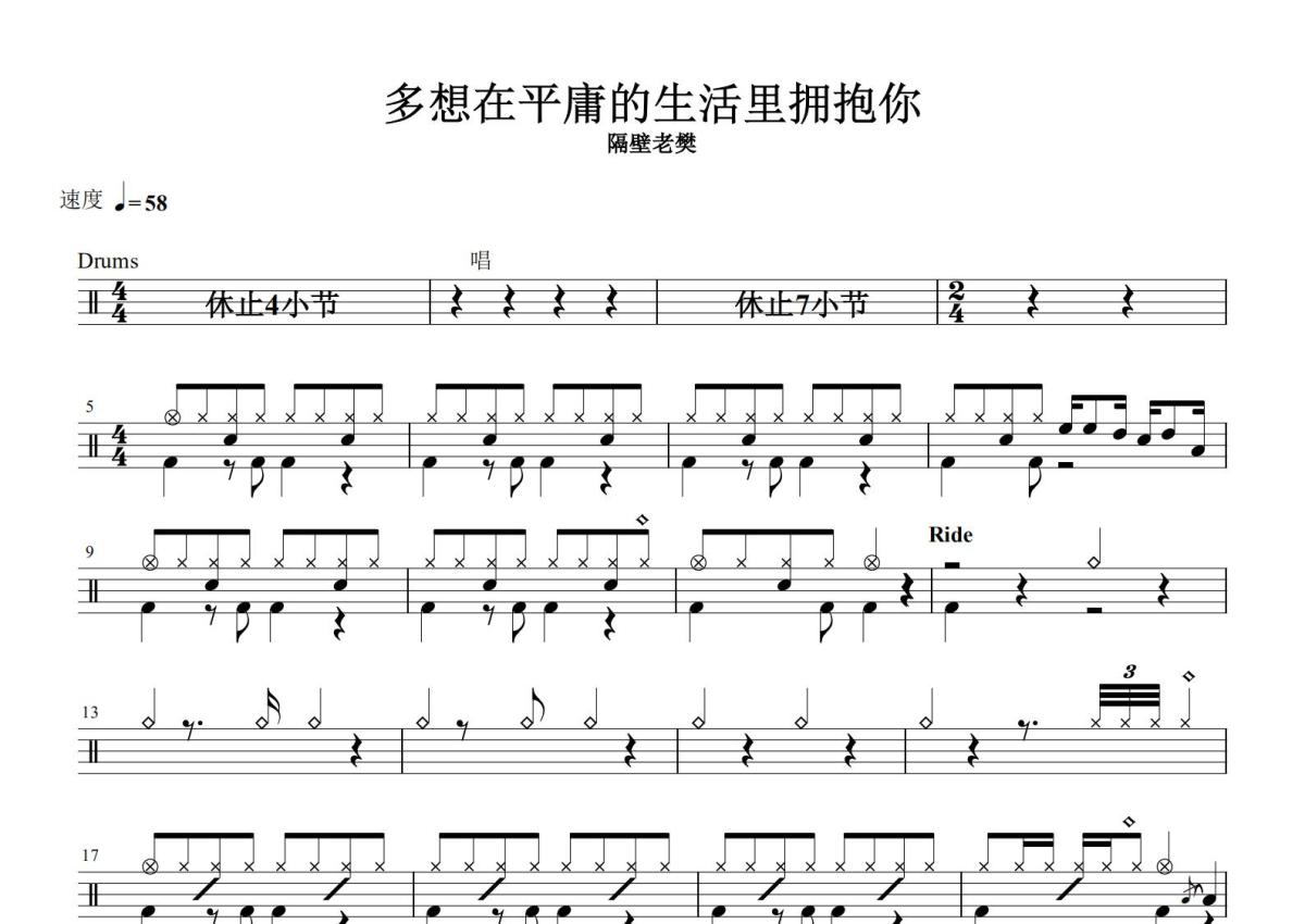 隔壁老樊《多想在平庸的生活拥抱你》鼓谱 - 架子鼓谱