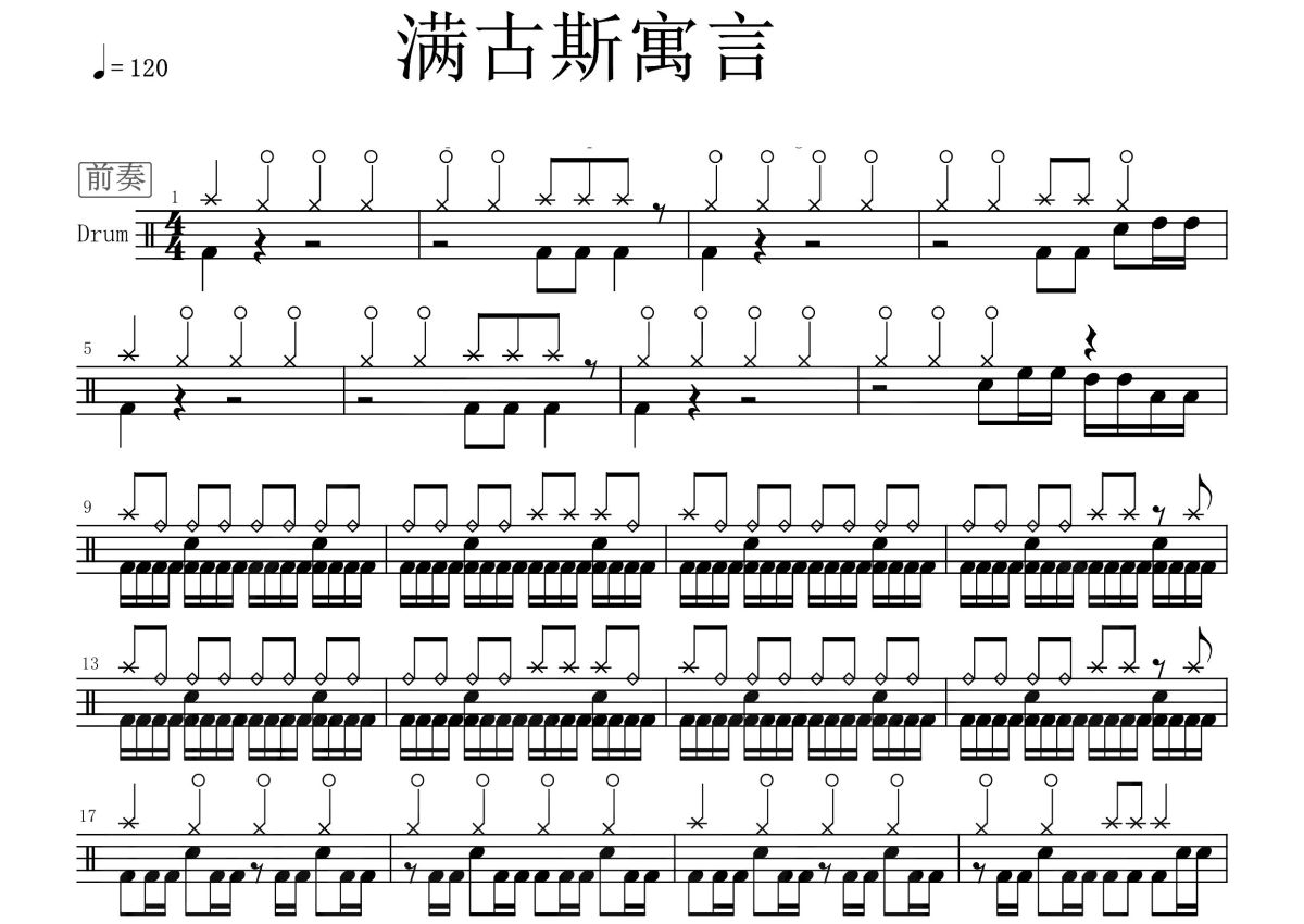 《满古斯寓言》是九宝乐队演唱的一首歌曲,这份鼓谱共有三张高清图谱,图谱由 @打鼓谱 编配上传,图谱使用五线谱编配,使用这份满古斯寓言架子鼓谱,你将能够轻松地敲打出这首九宝乐队的满古斯寓言,快来尝试吧。满古斯寓言 词:阿斯汗 曲:阿斯汗 编曲:九宝乐队 制作人:阿斯汗。