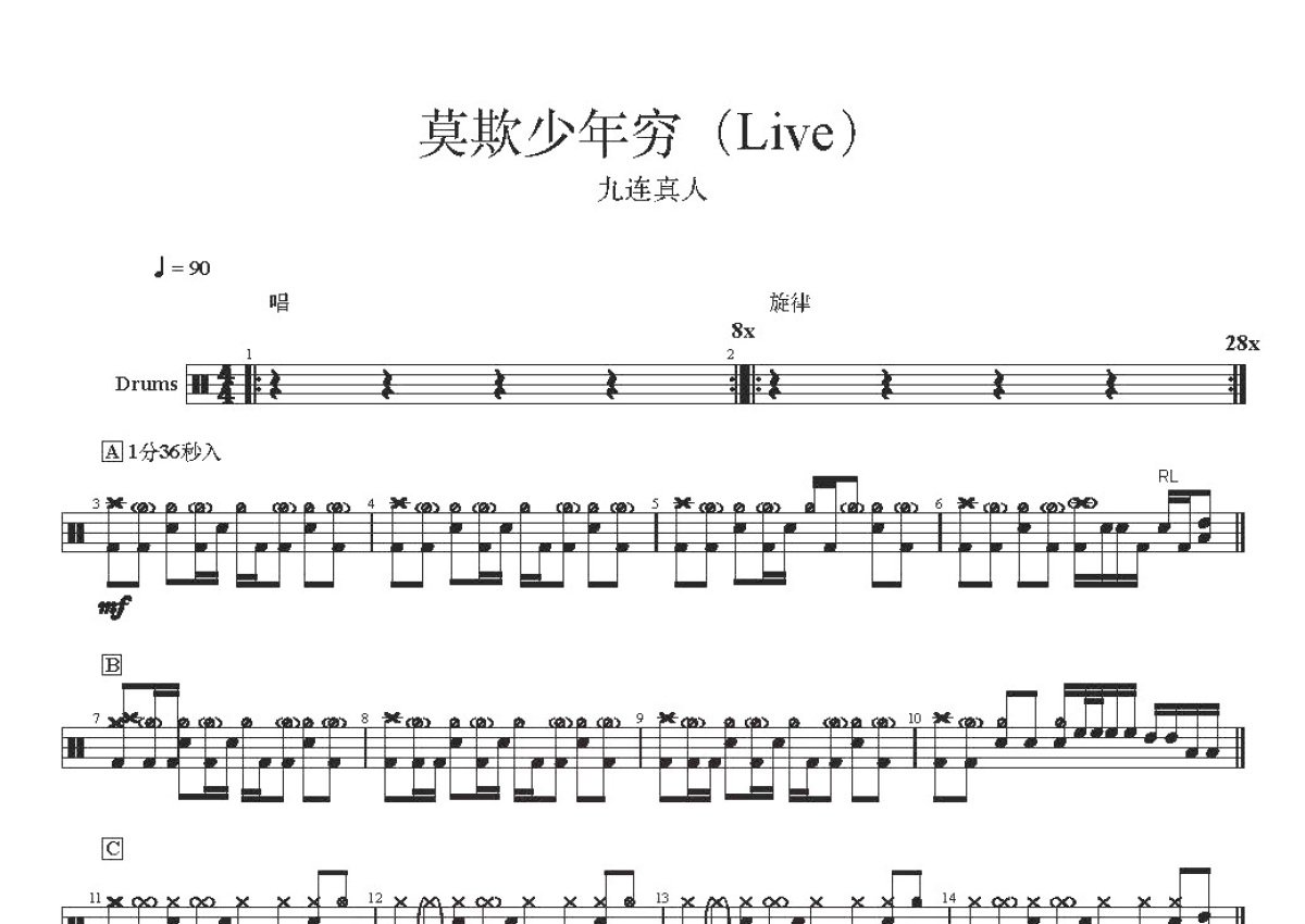 《莫欺少年穷》是九连真人演唱的一首歌曲,这份鼓谱共有三张高清图谱,图谱由 @打鼓谱 编配上传,图谱使用五线谱编配,使用这份莫欺少年穷架子鼓谱,你将能够轻松地敲打出这首九连真人的莫欺少年穷,快来尝试吧。《莫欺少年穷》是九连真人演唱的一首歌曲。九连真人是成立于2018年的中国内地摇滚乐队,由主唱/吉他手阿龙、副主唱/小号手与键盘阿麦、贝斯手万里、鼓手/小打吹米组成。 2018年,乐队获得滚石原创乐队大赛冠军。2019年3月,推出首支歌曲《莫欺少年穷》;同年,参加音乐综艺节目《乐队的夏天》。获得第11届中国摇滚迷笛奖年度最佳摇滚新人和年度最佳摇滚歌曲两个奖项。
