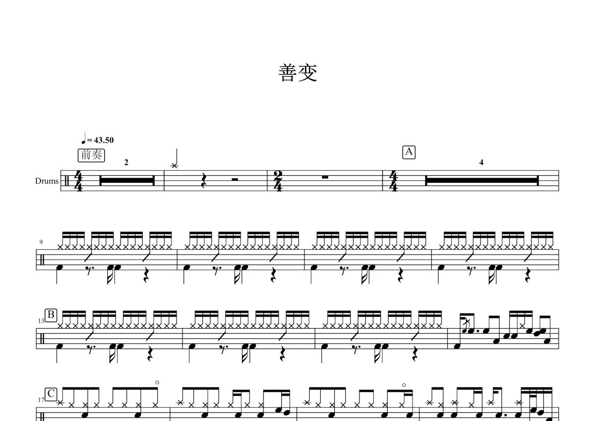 《善变》是王靖雯不胖演唱的一首歌曲,这份鼓谱共有两张高清图谱,图谱由 @打鼓谱 编配上传,图谱使用五线谱编配,使用这份善变架子鼓谱,你将能够轻松地敲打出这首王靖雯不胖的善变,快来尝试吧。《善变》是由米嘉郁作词,孙大雄作曲,王靖雯不胖演唱的歌曲,发行于2020年9月30日。
