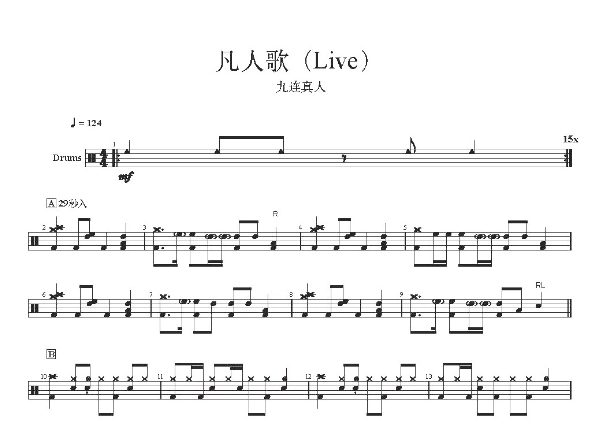 《凡人歌》是九连真人演唱的一首歌曲,live,这份鼓谱共有四张高清图谱,图谱由 @打鼓谱 编配上传,图谱使用五线谱编配,使用这份凡人歌架子鼓谱,你将能够轻松地敲打出这首九连真人的凡人歌,快来尝试吧。《凡人歌》九连真人现场版,九连真人是成立于2018年的中国内地摇滚乐队,由主唱/吉他手阿龙、副主唱/小号手与键盘阿麦、贝斯手万里、鼓手/小打吹米组成。 2018年,乐队获得滚石原创乐队大赛冠军。2019年3月,推出首支歌曲《莫欺少年穷》;同年,参加音乐综艺节目《乐队的夏天》。获得第11届中国摇滚迷笛奖年度最佳摇滚新人和年度最佳摇滚歌曲两个奖项。