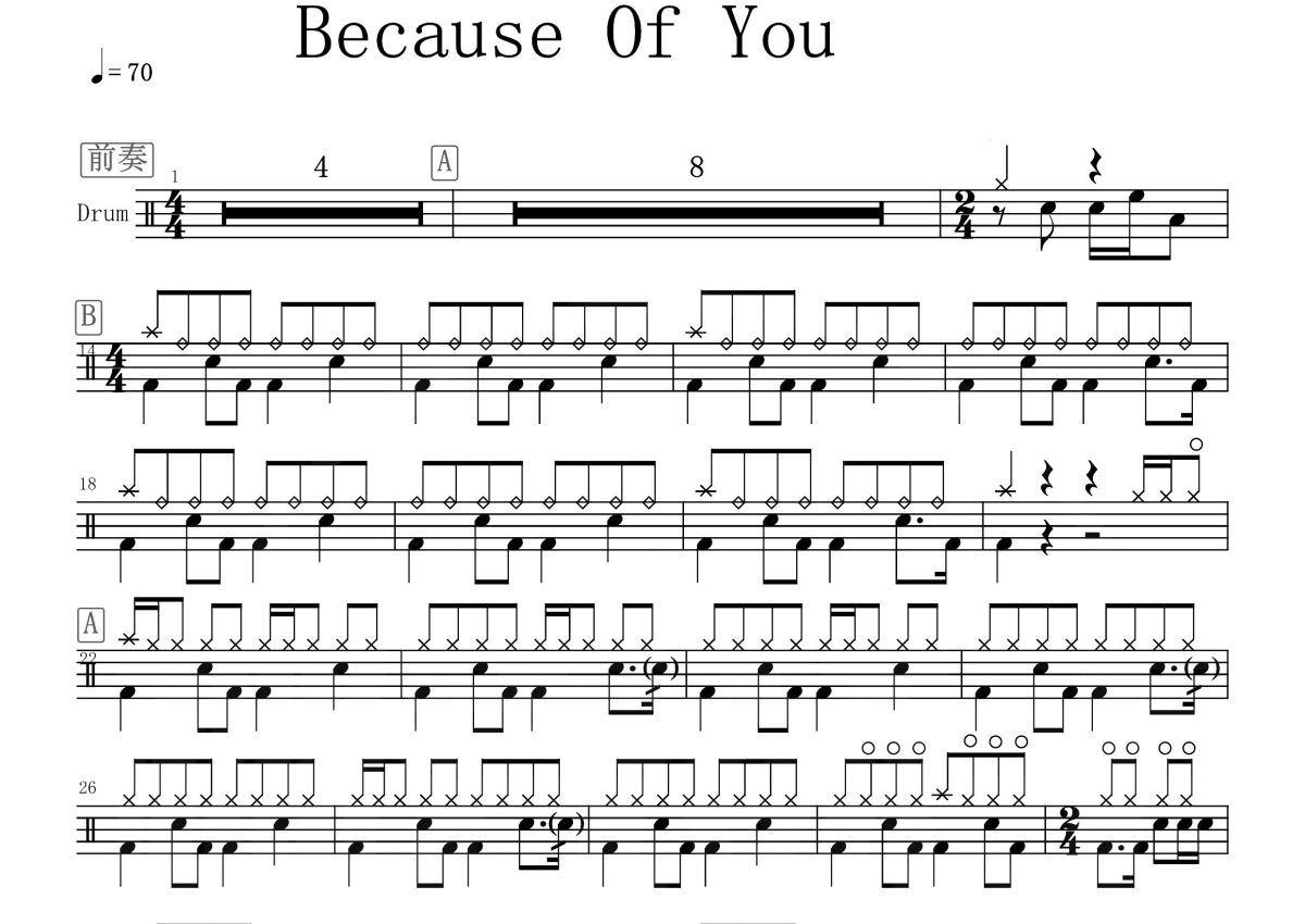 《Because Of You》是Kelly Clarkson演唱的一首歌曲,这份鼓谱共有两张高清图谱,图谱由 @打鼓谱 编配上传,图谱使用五线谱编配,使用这份Because Of You架子鼓谱,你将能够轻松地敲打出这首Kelly Clarkson的Because Of You,快来尝试吧。《Because of You》是美国流行摇滚女歌手凯莉·克莱森演唱的一首流行歌曲,歌曲的歌词由凯莉·克莱森个人完成,大卫·霍奇斯和本·穆迪负责音乐制作 。该歌曲收录在凯莉·克莱森于2004年11月30日发行的第二张录音室专辑《Breakaway》,并作为专辑中的第二张单曲,于2005年8月16日通过美国广播唱片公司发布。