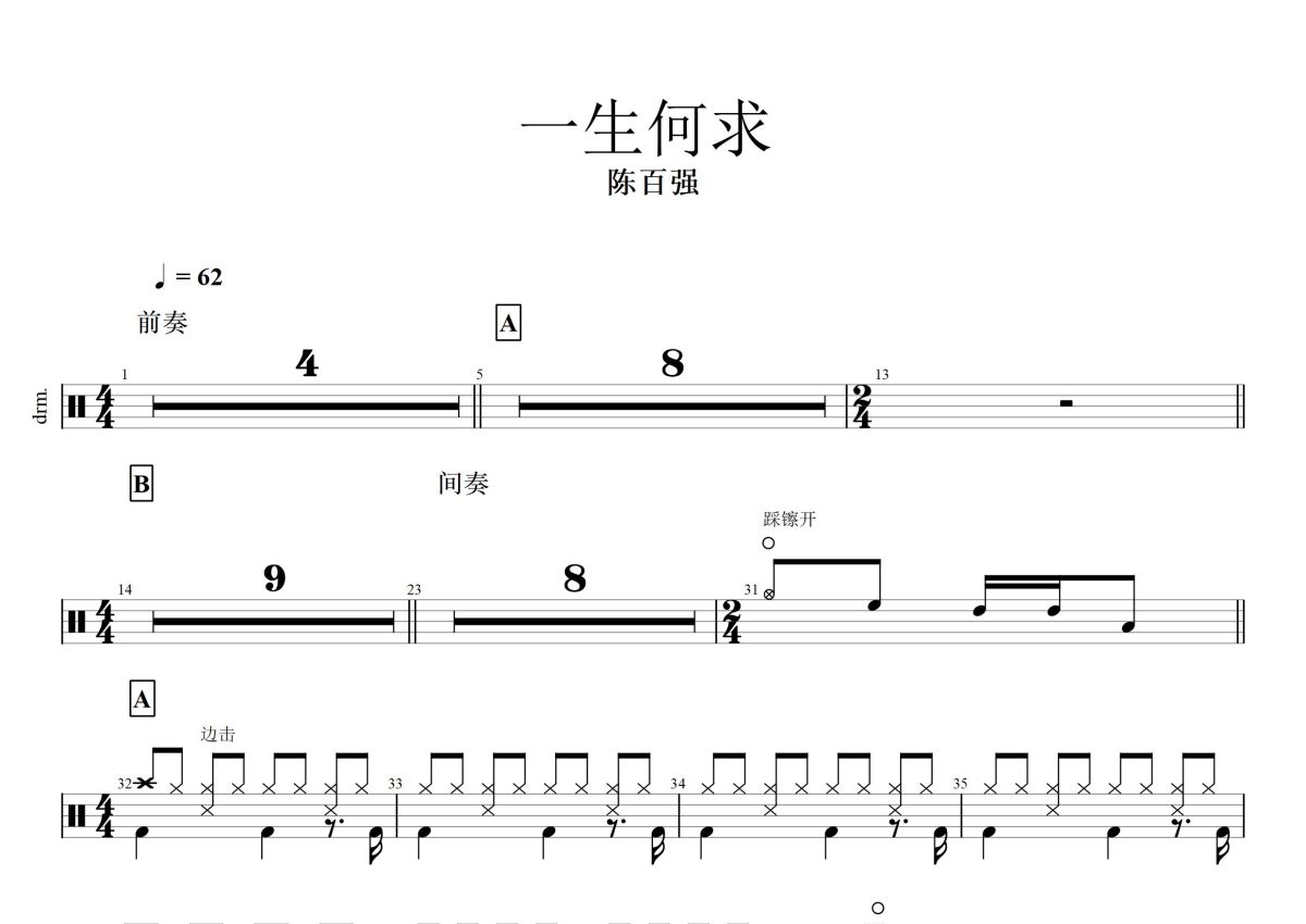 陈百强《一生何求》鼓谱 - 架子鼓谱