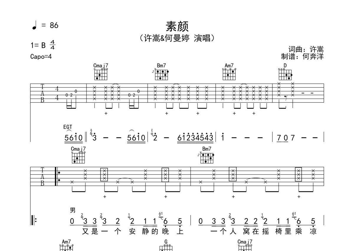 《素颜》是许嵩演唱的一首歌曲,本吉他谱采用的是G调指法编配,这份吉他谱共有四张高清图谱,图谱由 @何奔洋 编配上传,图谱使用六线谱编配,包含吉他和弦指法、简谱以及歌词部分,使用这份素颜吉他谱,可以让你更加方便地掌握这首歌曲的弹唱技巧,快来尝试吧。许嵩《素颜》吉他谱_G调吉他弹唱谱。
