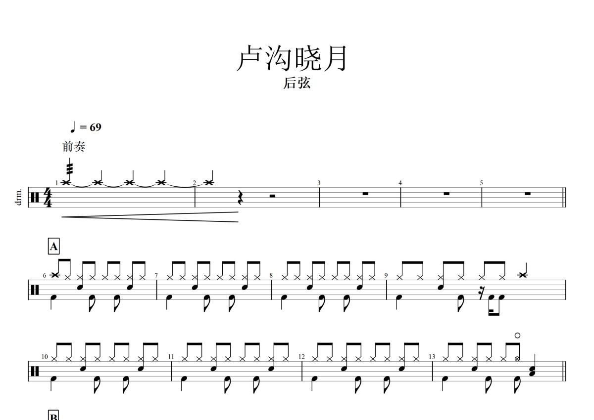 《卢沟晓月》是后弦演唱的一首歌曲,这份鼓谱共有两张高清图谱,图谱由 @打鼓谱 编配上传,图谱使用五线谱编配,使用这份卢沟晓月架子鼓谱,你将能够轻松地敲打出这首后弦的卢沟晓月,快来尝试吧。后弦 简介:后弦8月7日微博公布全新中国风新歌《卢沟晓月》歌词,歌曲已于9月18日新浪首发。 。