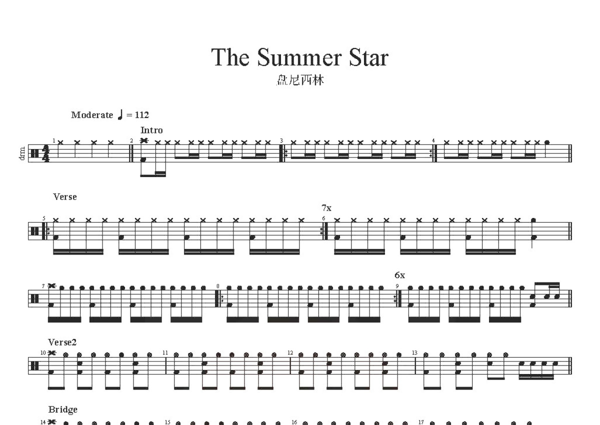 《The Summer Star》是盘尼西林乐队(Penicillin)演唱的一首歌曲,这份鼓谱共有两张高清图谱,图谱由 @打鼓谱 编配上传,图谱使用五线谱编配,使用这份The Summer Star架子鼓谱,你将能够轻松地敲打出这首盘尼西林乐队(Penicillin)的The Summer Star,快来尝试吧。《The Summer Star》盘尼西林乐队现场版。 盘尼西林乐队(Penicillin),是成立于2012年的中国内地摇滚乐队,由主唱张哲轩(小乐)、贝斯手熊花和鼓手小羊组成。019年5月,参加音乐综艺节目《乐队的夏天》。
