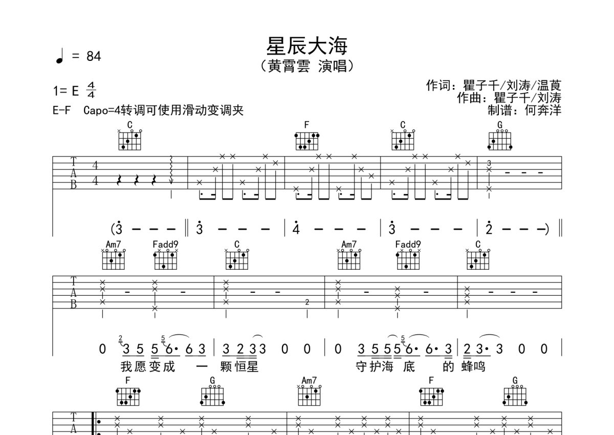 《星辰大海》是黄霄雲演唱的一首歌曲,本吉他谱采用的是C调指法编配,这份吉他谱共有三张高清图谱,图谱由 @何奔洋 编配上传,图谱使用六线谱编配,包含吉他和弦指法、简谱以及歌词部分,使用这份星辰大海吉他谱,可以让你更加方便地掌握这首歌曲的弹唱技巧,快来尝试吧。黄霄雲《星辰大海》吉他谱_C调吉他弹唱谱。