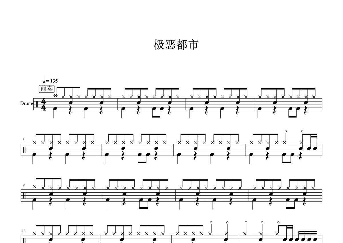 《极恶都市》是夏日入侵企划演唱的一首歌曲,这份鼓谱共有五张高清图谱,图谱由 @打鼓谱 编配上传,图谱使用五线谱编配,使用这份极恶都市架子鼓谱,你将能够轻松地敲打出这首夏日入侵企划的极恶都市,快来尝试吧。《极恶都市》是由夏日入侵企画演唱的一首歌曲,由王星填词,灰鸿啊、张光亿作曲,夏日入侵企画编曲,发行于2018 年6月1日,歌曲收录于专辑《极恶都市》中。