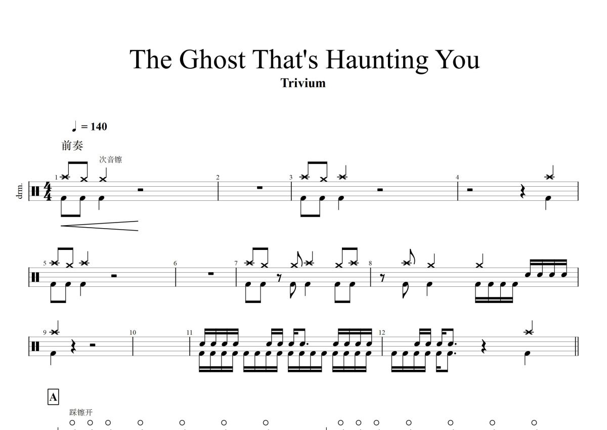 《The Ghost That’s Haunting You》是Trivium演唱的一首歌曲,这份鼓谱共有四张高清图谱,图谱由 @打鼓谱 编配上传,图谱使用五线谱编配,使用这份The Ghost That’s Haunting You架子鼓谱,你将能够轻松地敲打出这首Trivium的The Ghost That’s Haunting You,快来尝试吧。The Ghost That’s Haunting You Trivium 歌手与专辑 歌手:Trivium 专辑:Silence In the Snow (Special Edition) 。