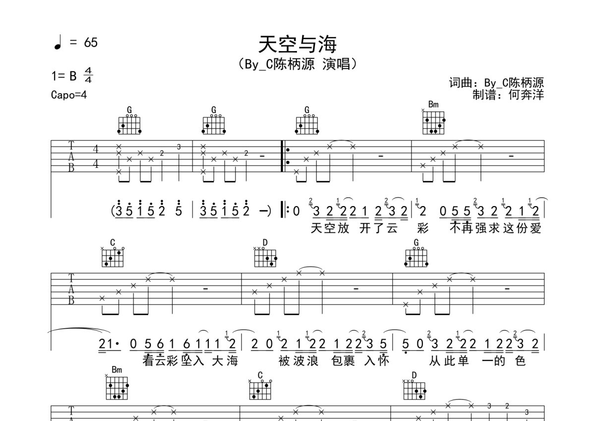 陈柄源《天空与海》吉他谱 - G调弹唱六线谱