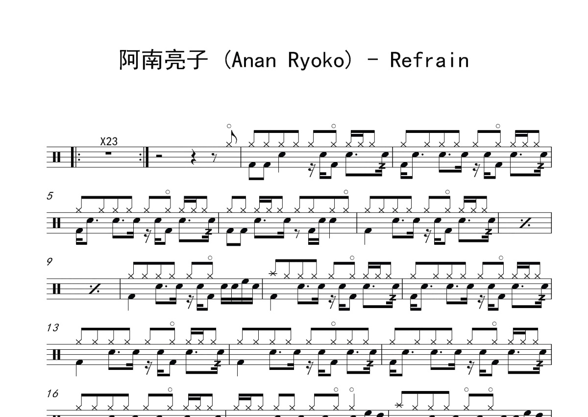 《Refrain》是阿南亮子 (Anan Ryoko)演唱的一首歌曲,这份鼓谱共有四张高清图谱,图谱由 @打鼓谱 编配上传,图谱使用五线谱编配,使用这份Refrain架子鼓谱,你将能够轻松地敲打出这首阿南亮子 (Anan Ryoko)的Refrain,快来尝试吧。《Refrain》是日本钢琴才女Anan Ryoko2011年所创钢琴曲,收录于其2011年6月8日发行的录音室专辑《Eternal Light》。