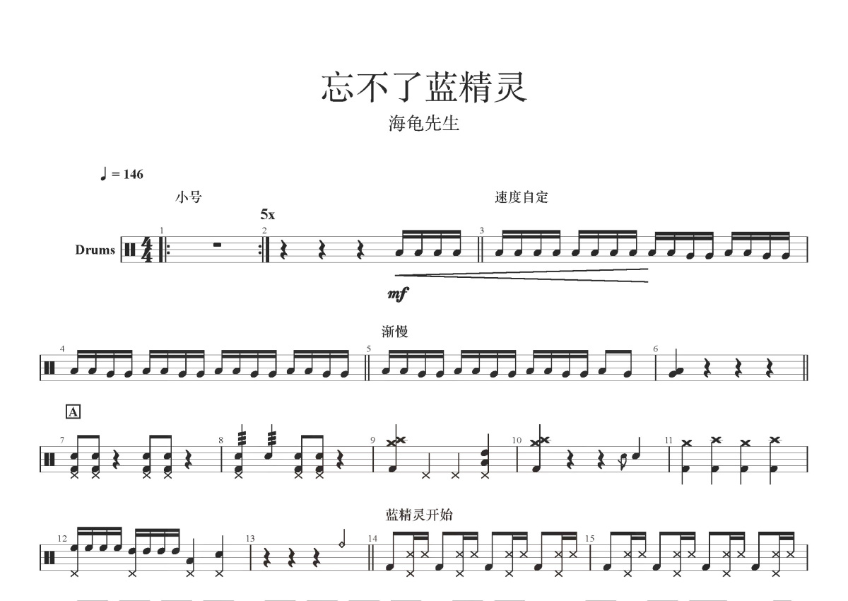 《忘不了蓝精灵》是海龟先生演唱的一首歌曲,这份鼓谱共有四张高清图谱,图谱由 @打鼓谱 编配上传,图谱使用五线谱编配,使用这份忘不了蓝精灵架子鼓谱,你将能够轻松地敲打出这首海龟先生的忘不了蓝精灵,快来尝试吧。《忘不了蓝精灵》海龟先生现场版。 海龟先生是中国内地摇滚乐队,由主唱李红旗、贝斯手蒋晗和吉他手黄巍组成。2004年12月,乐队正式成立。2012年,签约摩登天空,发行同名专辑《海龟先生》。2019年参加原创音乐综艺节目《乐队的夏天》,初赛凭借一首《男孩别哭》获得全场第一名的佳绩。