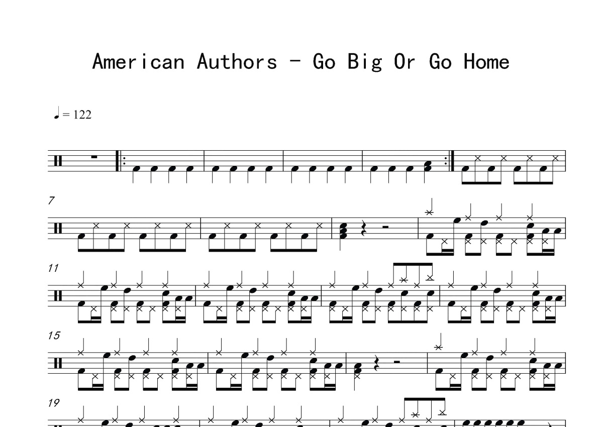 《Go Big or Go Home》是American Authors演唱的一首歌曲,这份鼓谱共有两张高清图谱,图谱由 @打鼓谱 编配上传,图谱使用五线谱编配,使用这份Go Big or Go Home架子鼓谱,你将能够轻松地敲打出这首American Authors的Go Big or Go Home,快来尝试吧。《Go Big or Go Home》是美国独立摇滚乐队American Authors于2015年发布的一首单曲 [1] ,后收录在专辑《What We Live For》中。