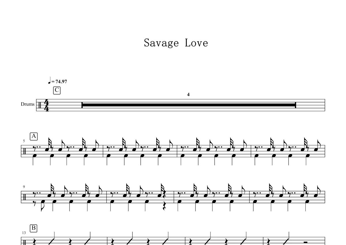 《Savage Love》是Jawsh 685&Jason Derulo&BTS演唱的一首歌曲,这份鼓谱共有两张高清图谱,图谱由 @打鼓谱 编配上传,图谱使用五线谱编配,使用这份Savage Love架子鼓谱,你将能够轻松地敲打出这首Jawsh 685&Jason Derulo&BTS的Savage Love,快来尝试吧。当K-POP顶流碰上TIK TOK神曲制造者,防弹少年团宣布发行全新Remix版本“Savage Love (Laxed-siren beat)"这首火爆全球的魔性洗脑单曲来自新西兰的鬼才音乐人Jawsh685创作,之后又与R&B天王Jason Derulo联手打造"Savage Love"(Laxed-Siren Beat),这首单曲也成为20年全球最现象级的单曲之一,曾登顶英国单曲榜,冲入Billboard单曲榜前十,并在19国收获单曲榜冠军。