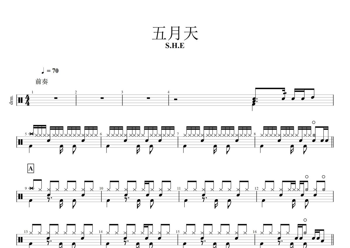 《五月天》是S.H.E演唱的一首歌曲,这份鼓谱共有两张高清图谱,图谱由 @打鼓谱 编配上传,图谱使用五线谱编配,使用这份五月天架子鼓谱,你将能够轻松地敲打出这首S.H.E的五月天,快来尝试吧。五月天这个团体没有《五月天》这首歌 《五月天》是she唱的 歌曲本身和五月天这个团体完全没关系 只是因为歌曲名和团名相同 所以she才专门找来五月天的阿信来合拍。