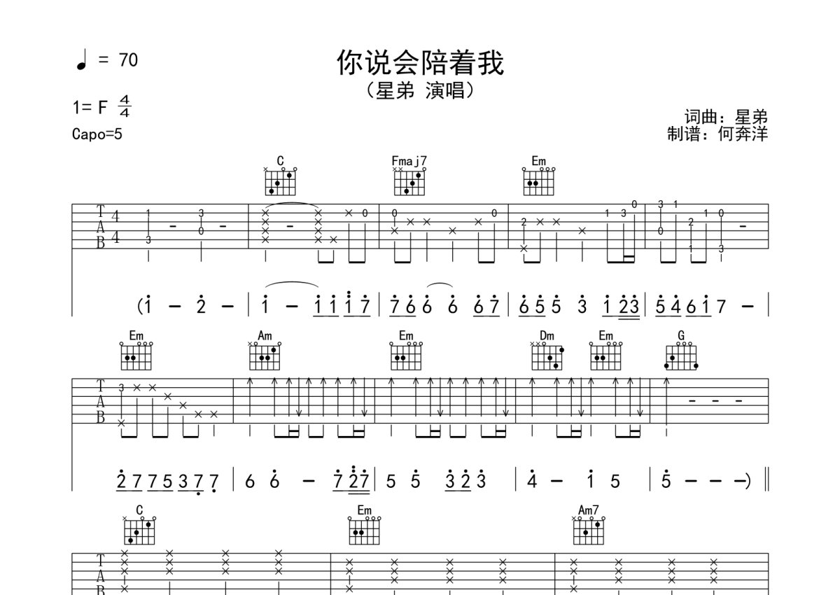 星弟《你说你会陪着我》吉他谱 - C调弹唱六线谱