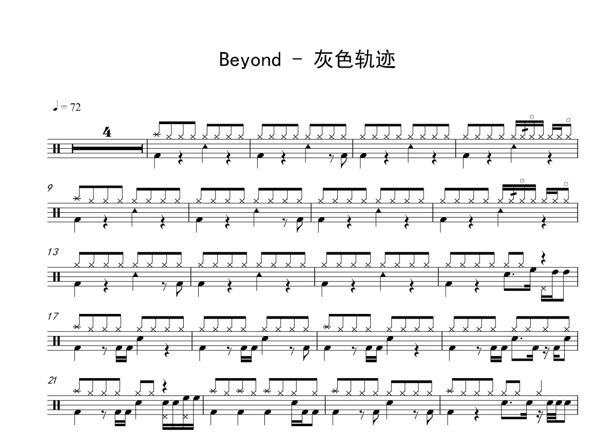 《灰色轨迹》是Beyond演唱的一首歌曲,这份鼓谱共有两张高清图谱,图谱由 @打鼓谱 编配上传,图谱使用五线谱编配,使用这份灰色轨迹架子鼓谱,你将能够轻松地敲打出这首Beyond的灰色轨迹,快来尝试吧。《灰色轨迹》是中国香港摇滚乐队Beyond的一首音乐作品(影视代表作),由刘卓辉作词,黄家驹作曲并演唱,Beyond编曲。该歌曲是1990年刘德华、吴倩莲主演的电影《天若有情》的插曲,最早收录在新艺宝唱片公司1990年6月发行的《天若有情》电影原声带中 [1] ,后收录在Beyond1992年由新艺宝唱片公司发行的精选集《Control》中 [2] 。