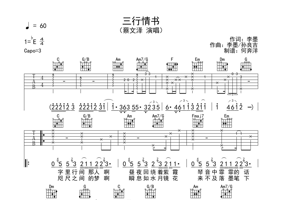 《三行情书》是蔡文泽演唱的一首歌曲,本吉他谱采用的是C调指法编配,这份吉他谱共有三张高清图谱,图谱由 @何奔洋 编配上传,图谱使用六线谱编配,包含吉他和弦指法、简谱以及歌词部分,使用这份三行情书吉他谱,可以让你更加方便地掌握这首歌曲的弹唱技巧,快来尝试吧。蔡文泽《三行情书》吉他谱_C调吉他弹唱谱。